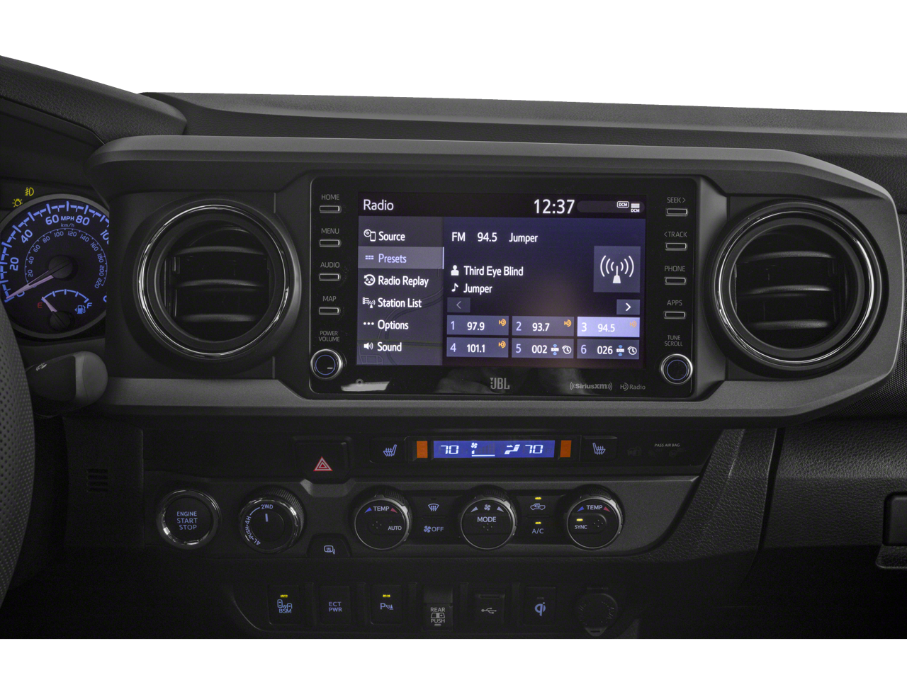 Elevate your driving experience with the exceptional features of the Tacoma TRD Pro. The rugged Black Overfenders and bold Hood Graphics command attention, while the premium JBL audio system and integrated navigation ensure you stay connected and entertained on the road. Enjoy the convenience of Dual Zone Automatic Climate Control, Smart Key with Push Button Start, and the power of a moonroof to let the outdoors in.