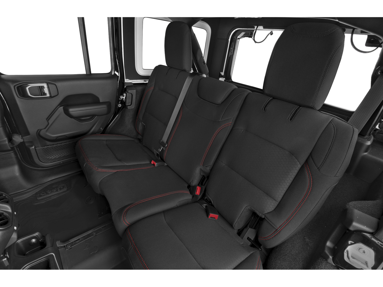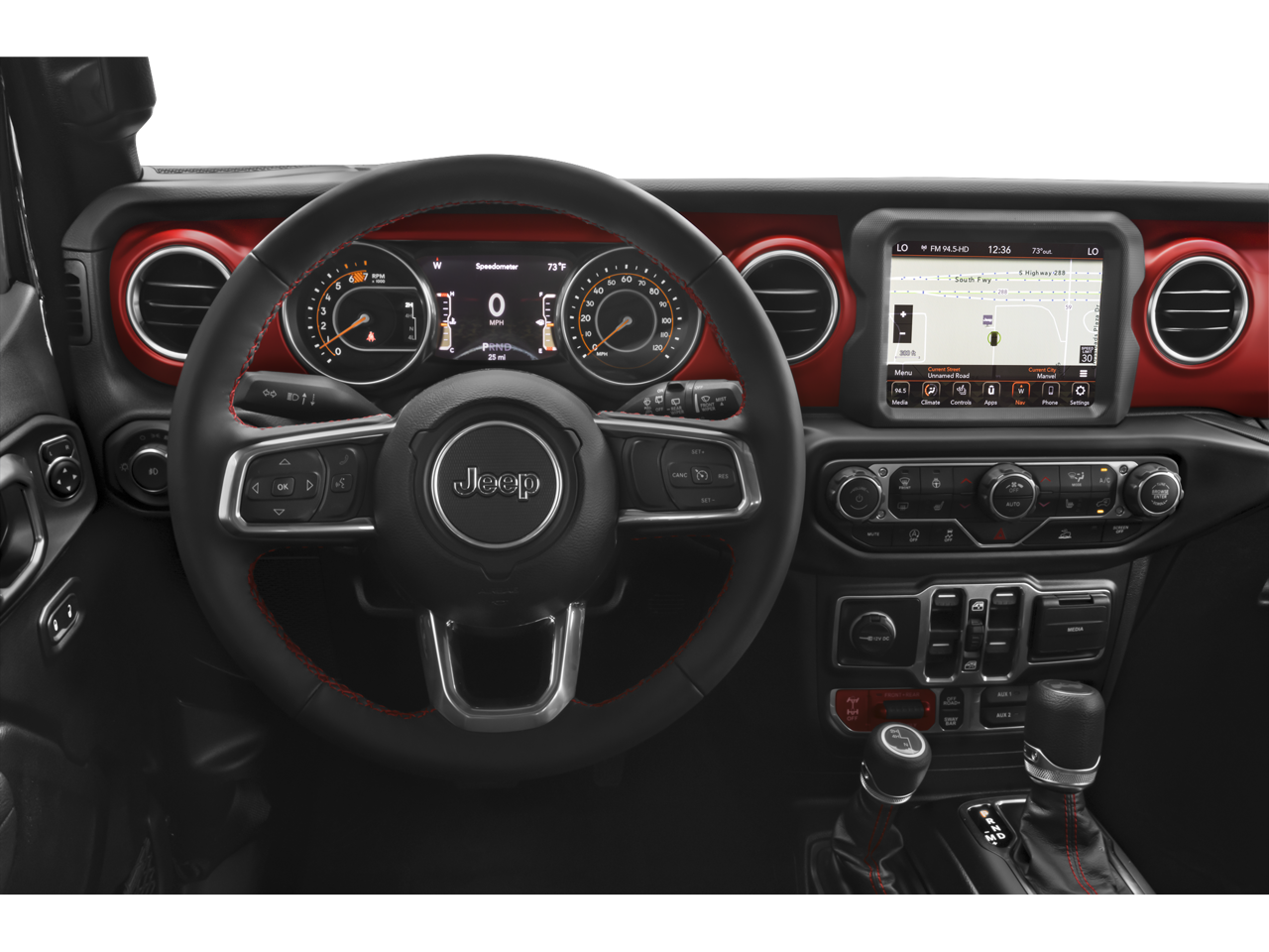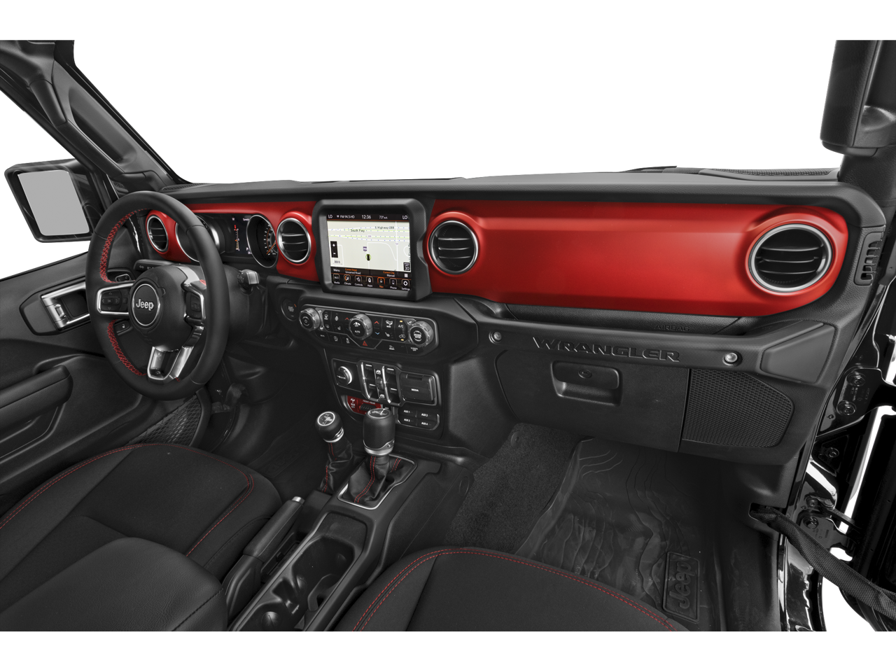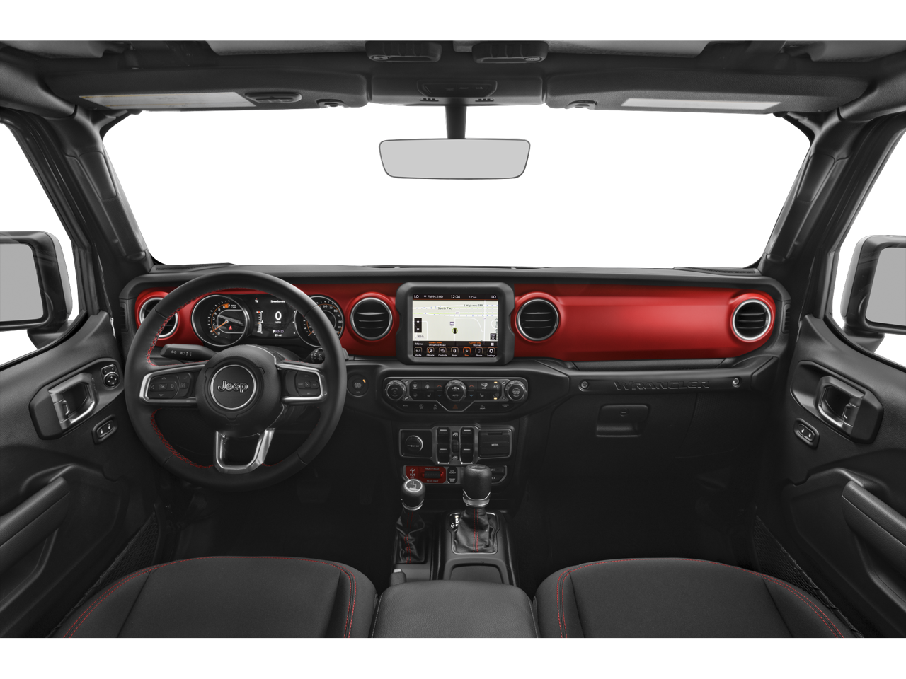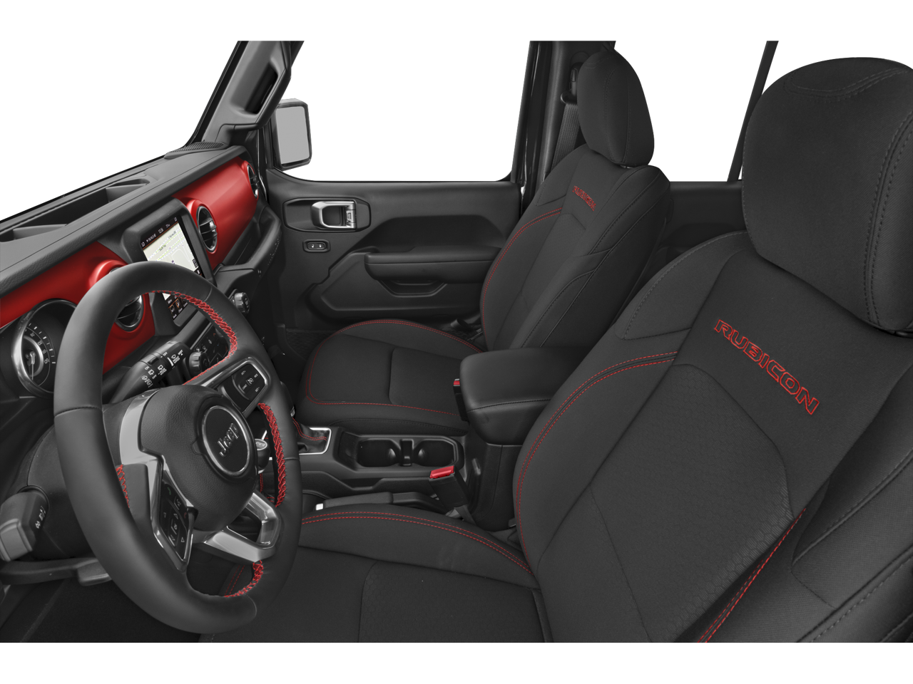 The interior of the Wrangler Rubicon is a masterful blend of rugged capability and modern convenience. Enjoy the convenience of the Uconnect 4C Nav system with an 8.4-inch display, providing intuitive control over your music, navigation, and connectivity. The premium cloth low-back bucket seats offer exceptional comfort, while the split-folding rear seat and Freedom Panel storage bag ensure ample cargo space for all your adventures.